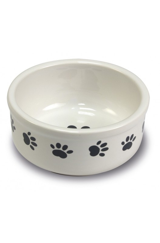Elegante comedero de cerámica para perros y gatos, se puede utilizar también como bebedero. Comedero blanco con estampación de huellas. Diámetro: 15 cm