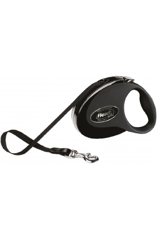 Correa de cinta de 5 metros. Para perro de hasta 25 kg Asa blanda Gancho cromado Peso del producto: aprox. 240 g 4 colores: azul, rosa, blanco y negro