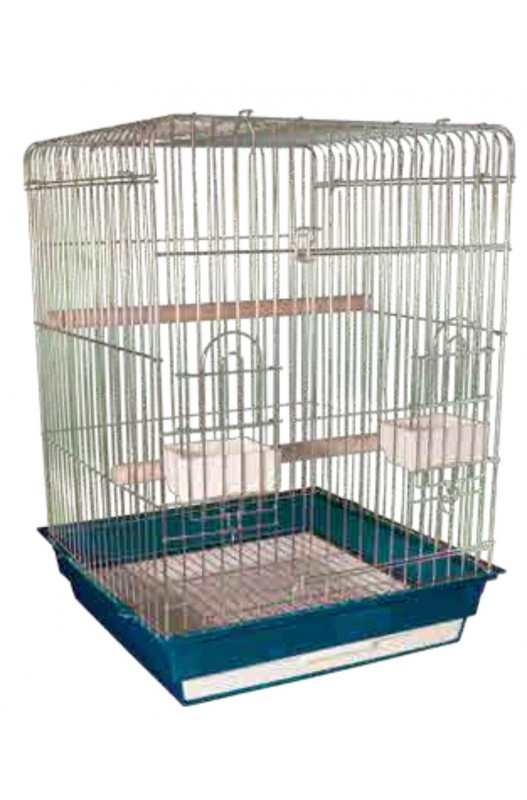 Jaula alta, ideal para loros. Con bandeja extraible, comedero, bebedero y saltadores de madera. Medidas: 47 x 47 x 68 cm.