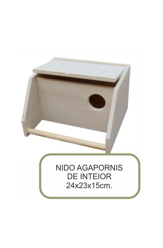 Nido para agapornis, ideal para una ambientación de tipo natural. Madera natural, sin ningún elemento tóxico para los pájaros. Medida: 24 x 23 x 15cm