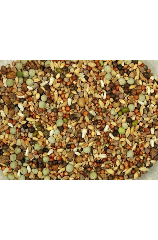 Composición a base de cereales, leguminosas y oleaginosas combinados de forma que aportan a las palomas la dosis perfecta de proteínas, grasas, minerales y vitaminas para su desarrollo, mantenimiento.