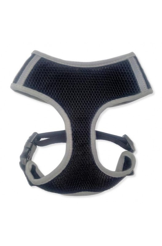Petral de color negro y ribete gris, para perros. Talla M: Cuello 30 cm – pecho 35-50 cm.