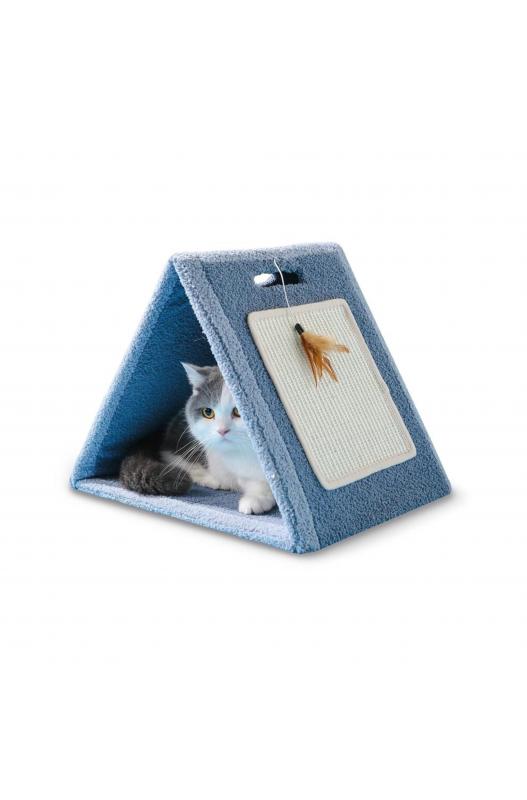 El rascador para gatos Triangle es un rascador con zona interior de descanso en forma de pirámide triangular. En la parte exterior tiene una cuerda que lleva colgando una pluma para que el gato juegue. Es plegable